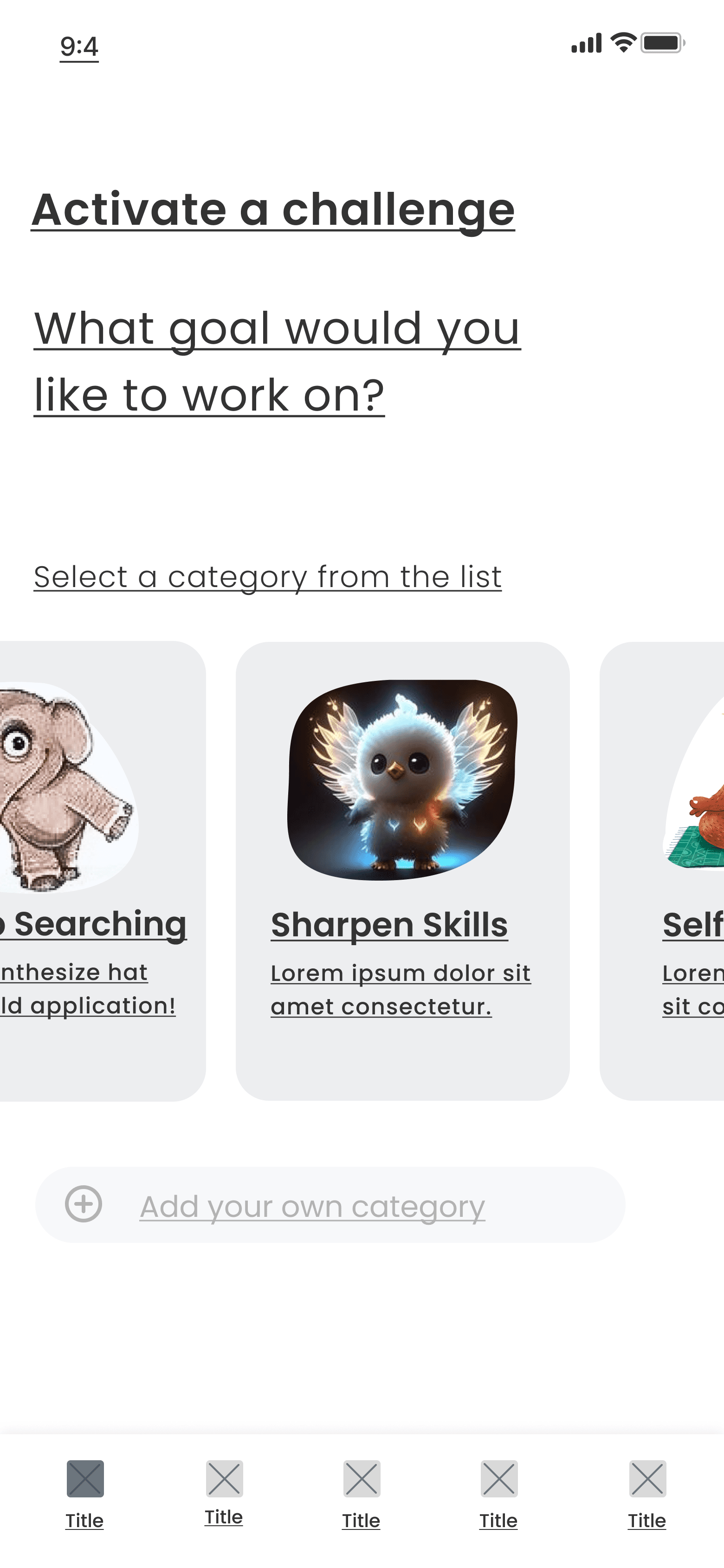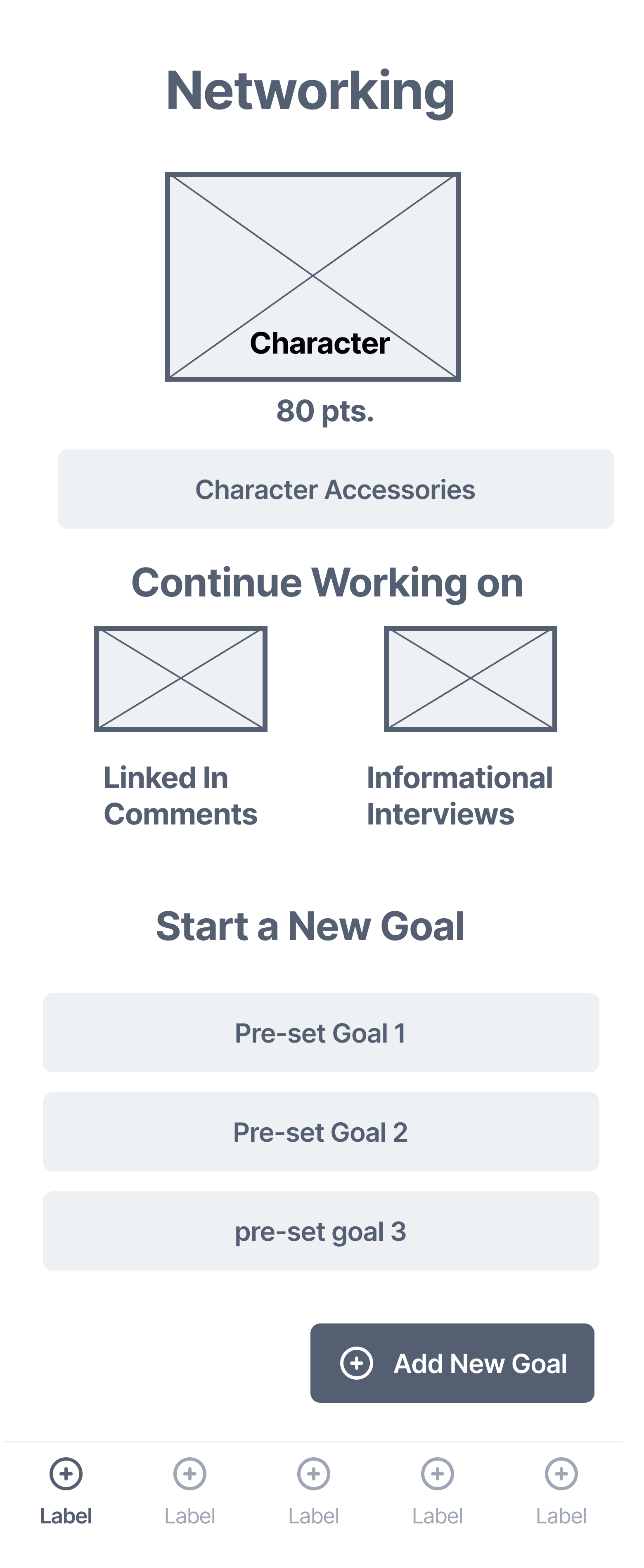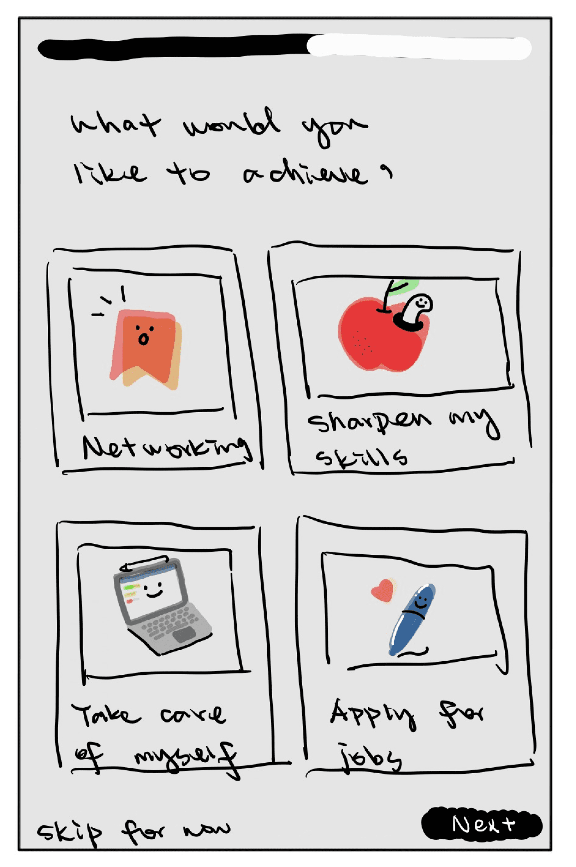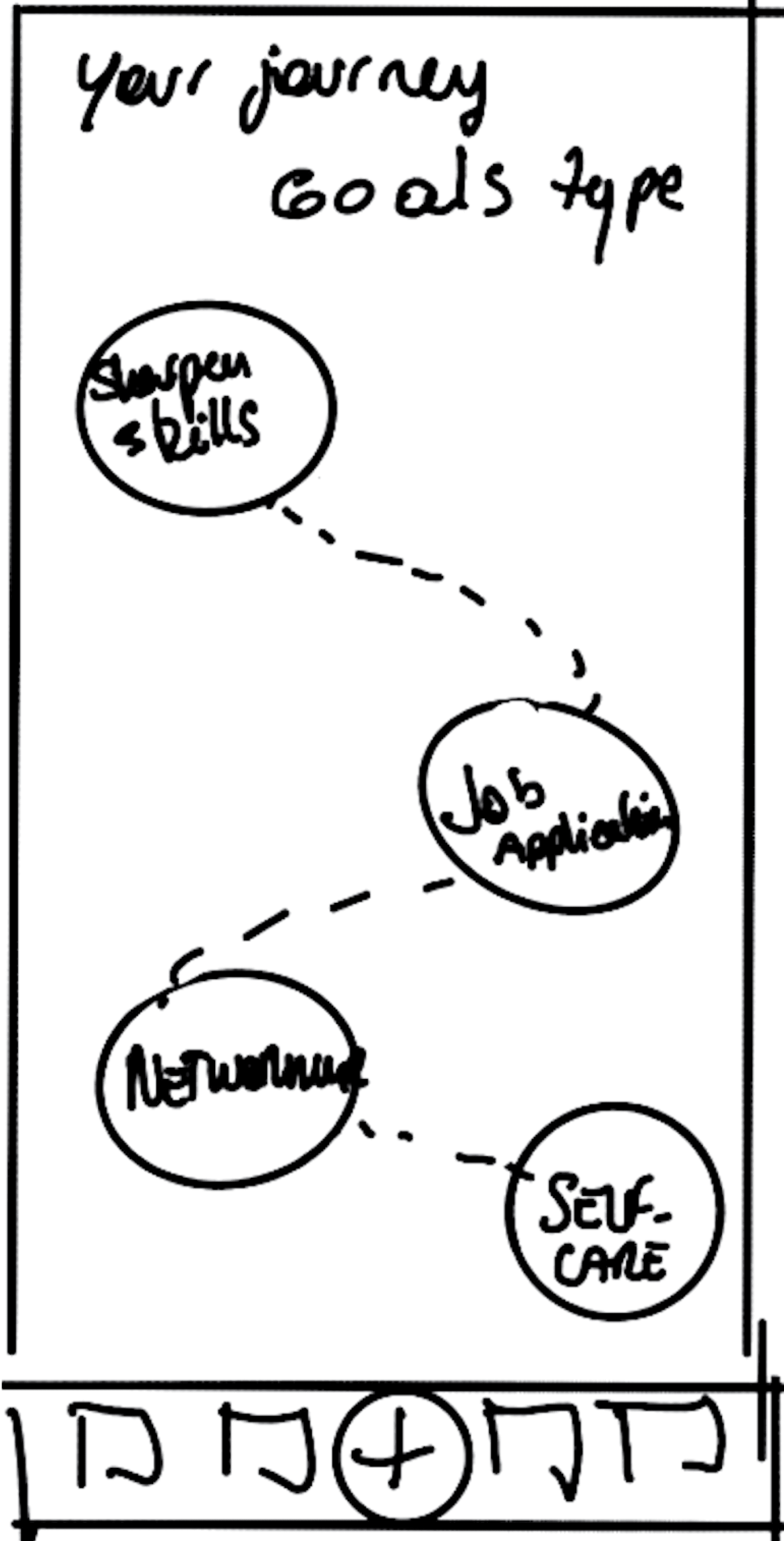 We break down the goals into the following 4 different categories: sharpening skills, job application, networking, and mental health & selfcare. From there, we created sketches and lo-fi wireframes to visualize the process of the users selecting a goal to achieve.